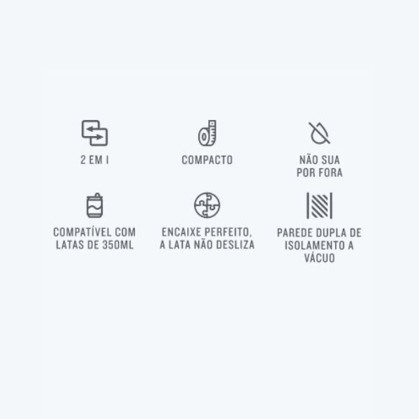 Compacto e funcional, é compativel com latas de 350ml, capacidade para 296ml (caso seja usado como copo), tornando-se indispensável para todos os momentos de celebração.